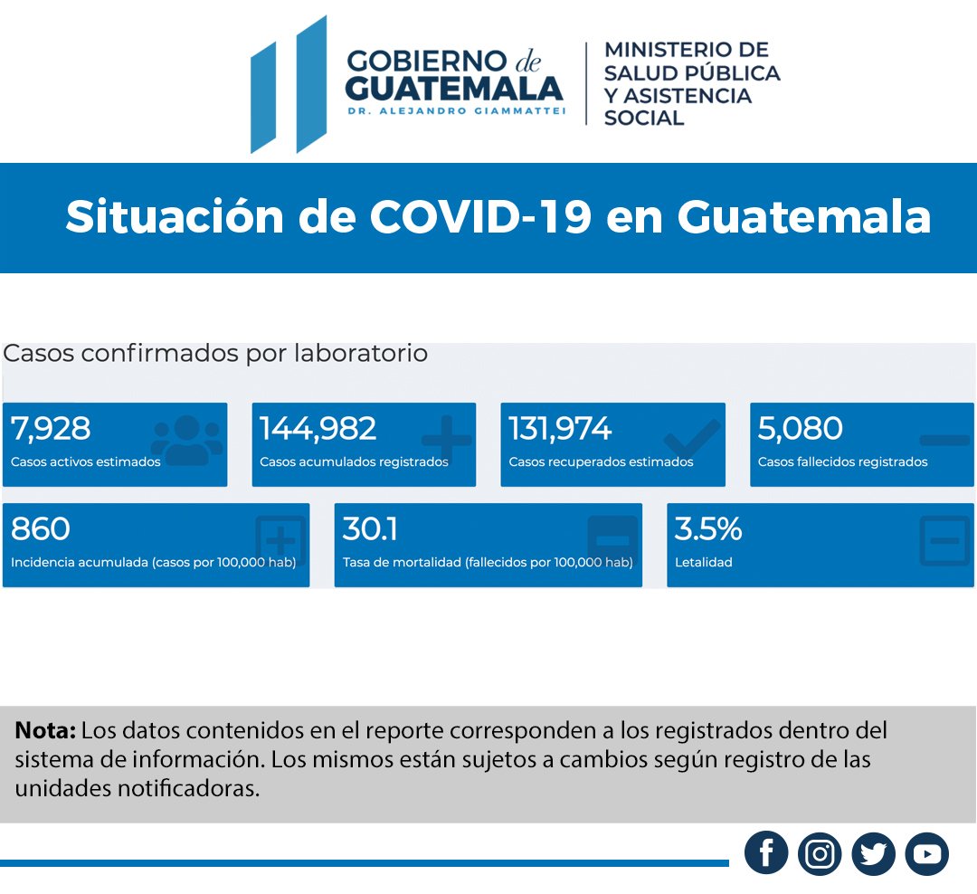 En total en Guatemala se han registrado 144,982 contagios de coronavirus de los cuales, el MSPAS indica que 131,974 se han recuperado y 7,928 siguen activos.
