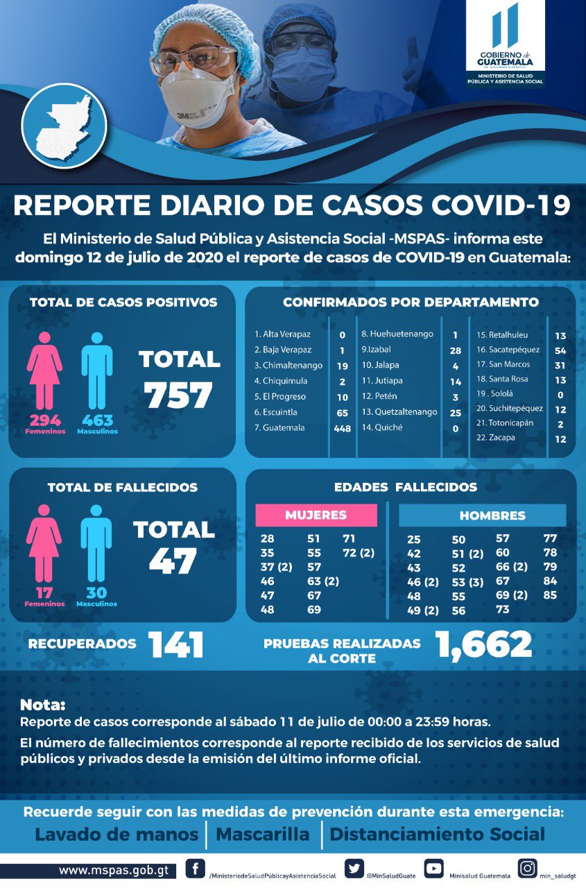 Los datos aportados por las autoridades de Salud correspondientes al día de ayer, sábado 11 de junio, son: 757 casos nuevos de COVID-19. Además indica que el número de recuperados es de 141 personas y se registran 47 fallecidos por la enfermedad. Según el MSPAS se realizaron 1,662 pruebas al corte.