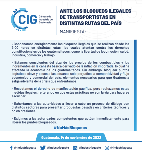 A través de un comunicado, la Cámara de Industria Guatemalteca, (CIG), manifestó su rechazo a los bloqueos por considerar que son ilegales. Además, los industriales destacan que este tipo de acciones atentan contra los derechos de los guatemaltecos como la libertad de locomoción, salud, industria, comercio y trabajo.