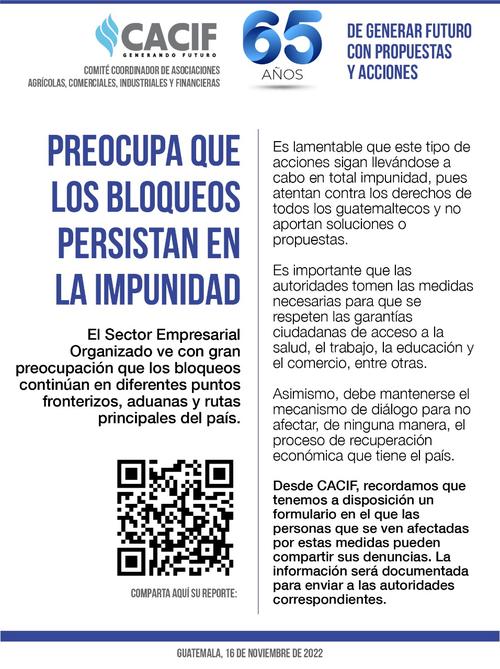Asimismo, el Comité Coordinador de Asociaciones Agrícolas, Comerciales, Industriales y Financieras, (CACIF), se refirió al impacto que generan este tipo de bloqueos.