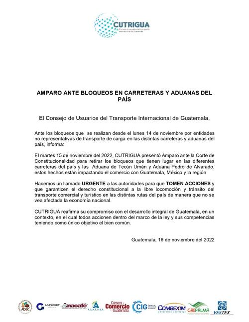 Por su parte, la Asociación de Exportadores de Guatemala, que forma parte del Consejo de usuarios de transporte internacional de Guatemala, (Cutrigua), expresó su preocupación ante las pérdidas económicas. También dieron a conocer que presentaron un amparo ante la Corte de Constitucionalidad, para retirar los bloqueos.