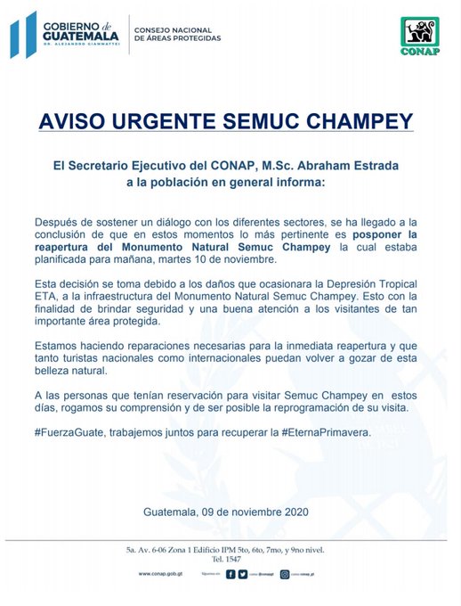 El Consejo Nacional de Áreas Protegidas (CONAP) informó a través de un comunicado oficial que Semuc Champey, permanecerá cerrado por los daños causados por la depresión tropical Eta.