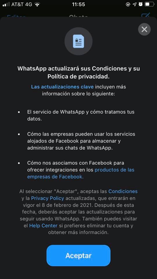 Los cambios serán vigentes a partir del próximo 8 de febrero y son obligatorios, es decir que los usuarios no podrán usar WhatsApp sin aceptar las nuevas políticas de privacidad.