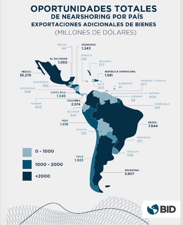 Un comunicado del Banco Interamericano de Desarrollo (BID), informa que la ganancia potencial para América Latina y el Caribe de las oportunidades de nearshoring en el corto y mediano plazo podrían representar un aumento de hasta US$78.000 millones en nuevas exportaciones de bienes y servicios.