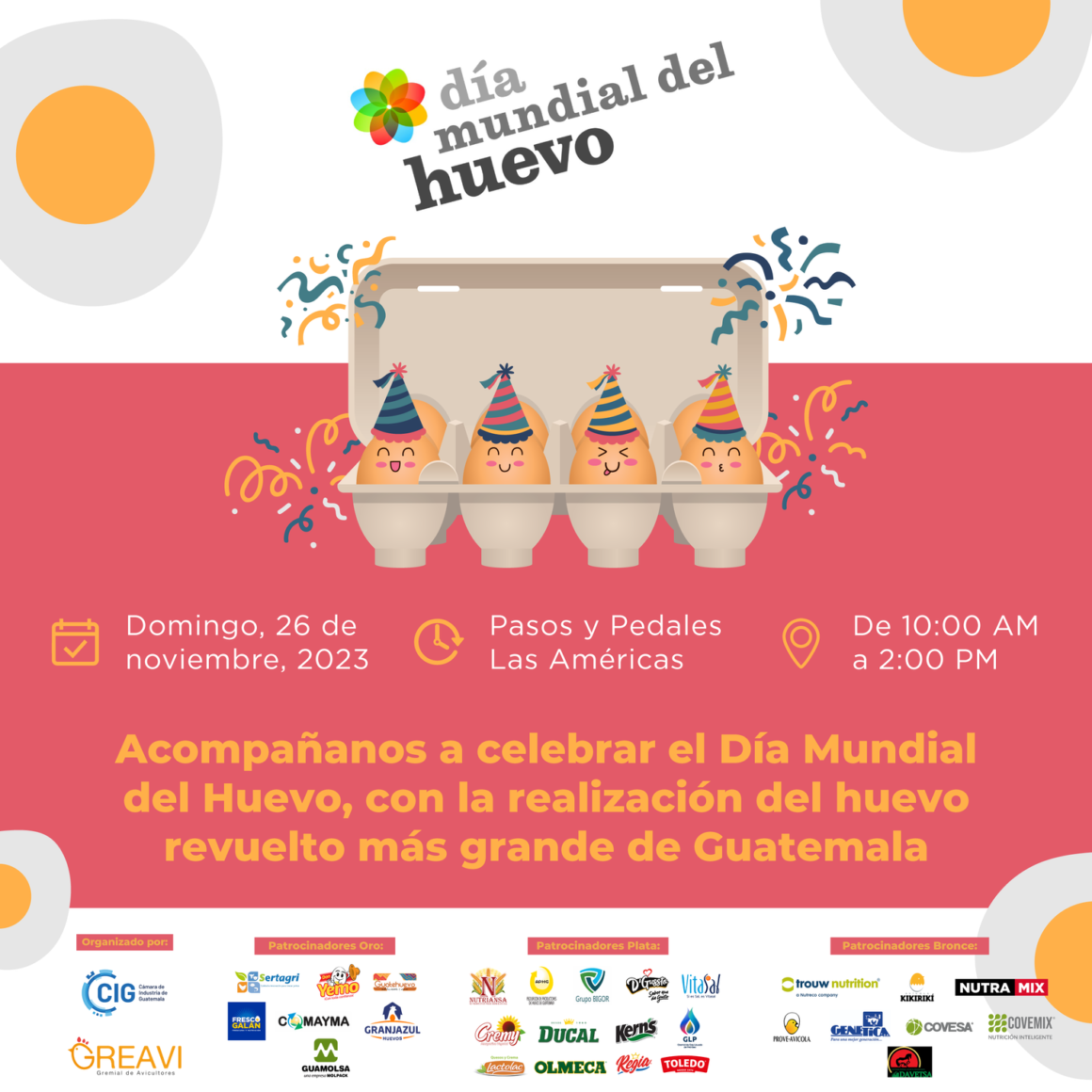 La Gremial de Avicultores (GREAVI), perteneciente a la Cámara de Industria de Guatemala (CIG), se prepara para celebrar de manera monumental el Día Mundial del Huevo el próximo domingo 26 de noviembre de 2023 en Pasos y Pedales de Las Américas, zona 13, de 10:00 a.m. a 2:00 p.m. La ocasión será testigo del rompimiento de un récord nacional al crear el huevo revuelto más grande de Guatemala, compuesto por 5,040 huevos.