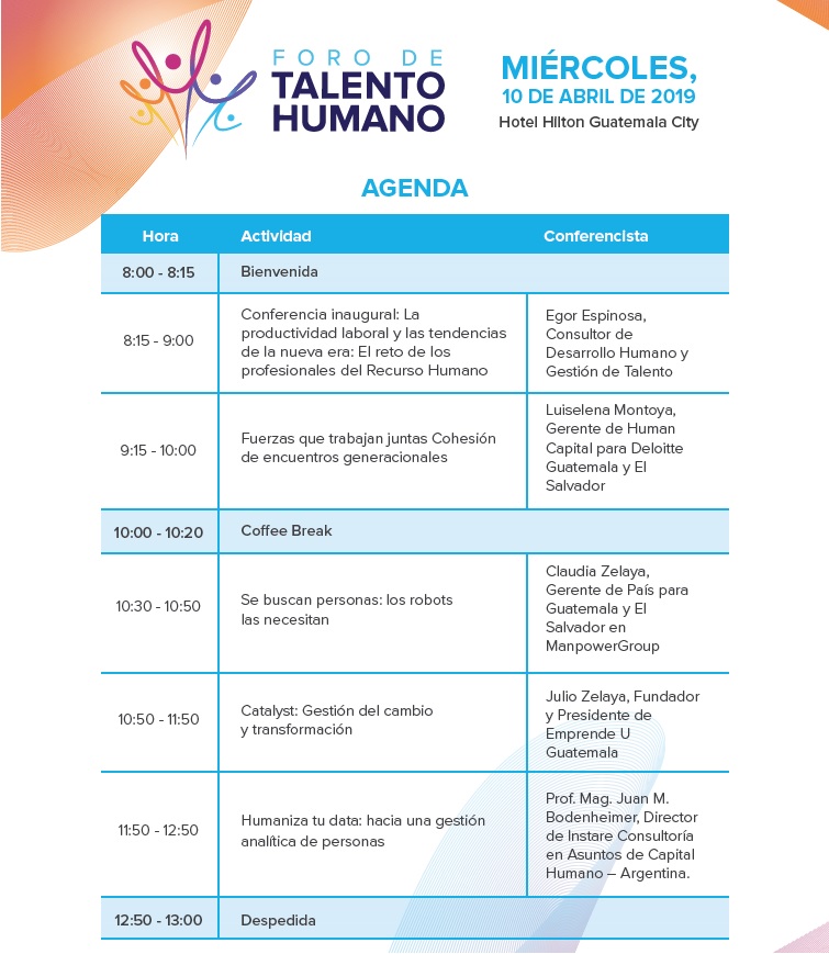 Más de 200 personas participan en la primera edición de este evento que reúne a conferencistas nacionales y extranjeros, quienes presentarán las nuevas tendencias dirigidas a lograr el desarrollo integral de los colaboradores y de la productividad en equilibrio con el entorno, basados en el encuentro de generaciones en posiciones de liderazgo e impacto de la transformación digital. Este evento está abierto a empresarios, emprendedores y estudiantes que estén interesados en generar valor a través de la buena gestión del talento en las empresas.