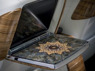 En el interior, cuenta con la incrustación de acero inoxidable y oro más grande jamás realizada para un Phantom que representa un esquema abstracto de un movimiento de reloj. El reloj de Rolls-Royce está engastado en una caja de plata maciza con técnica decorativa guilloché.