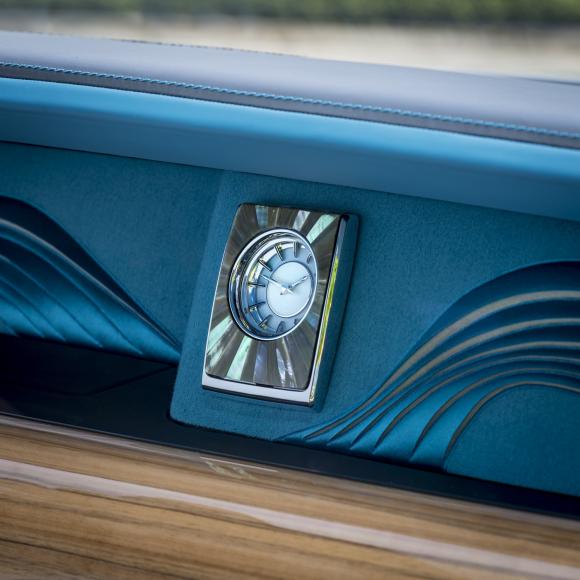 En el interior, cuenta con la incrustación de acero inoxidable y oro más grande jamás realizada para un Phantom que representa un esquema abstracto de un movimiento de reloj. El reloj de Rolls-Royce está engastado en una caja de plata maciza con técnica decorativa guilloché.