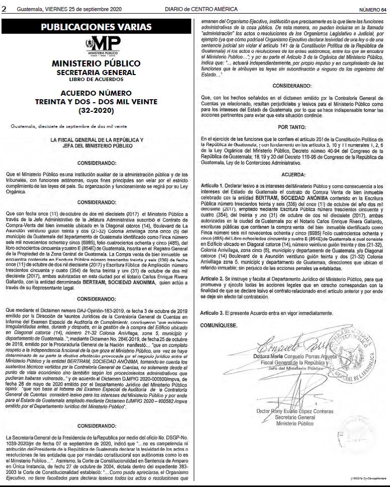 Hoy, el Diario Oficial publicó el Acuerdo número 32-2020, que declara lesiva la compra del “edificio fantasma”. Este caso señala directamente a Thelma Aldana, responsable de la transacción en todos los documentos. Alfredo García, analista político, considera que se trata de una medida acertada. Entretanto, el presidente de la Fundación Contra el Terrorismo, querellante en el caso, expresa que es momento de pedir la orden de captura internacional contra la ex funcionaria prófuga. El vocero del MP, Juan Luis Pantaleón, mencionó que la orden de captura nacional sigue vigente y que la solicitud de código rojo está en proceso.
