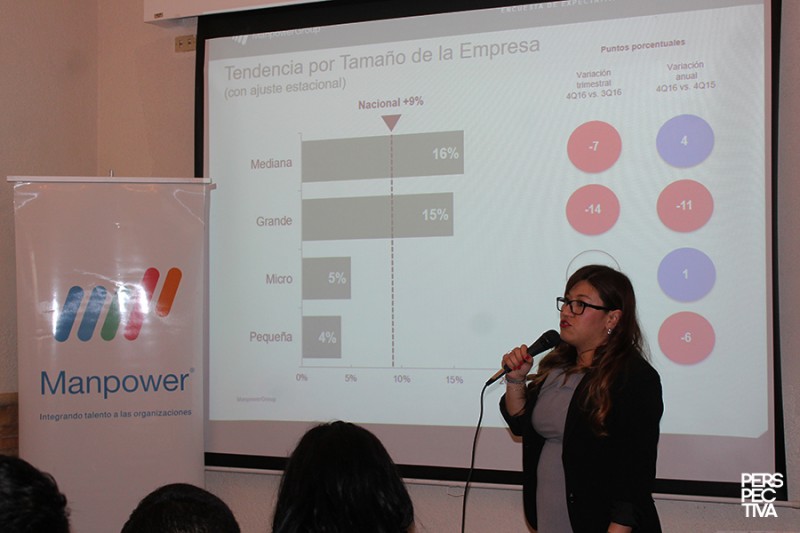Se espera un incremento en los niveles de contratación en las cuatro categorías por tamaño de empresa durante el periodo octubre-diciembre. Empleadores en las medianas empresas lideran en esta ocasión más los planes de contratación más fuertes con una próspera Expectativa Neta de Empleo de +16%, seguidas por los empleadores de las empresas grandes que reportan una Expectativa Neta de Empleo de +15%. Por otra parte, los pronósticos son de +5% para las micro-firmas y de +4% para las pequeñas.