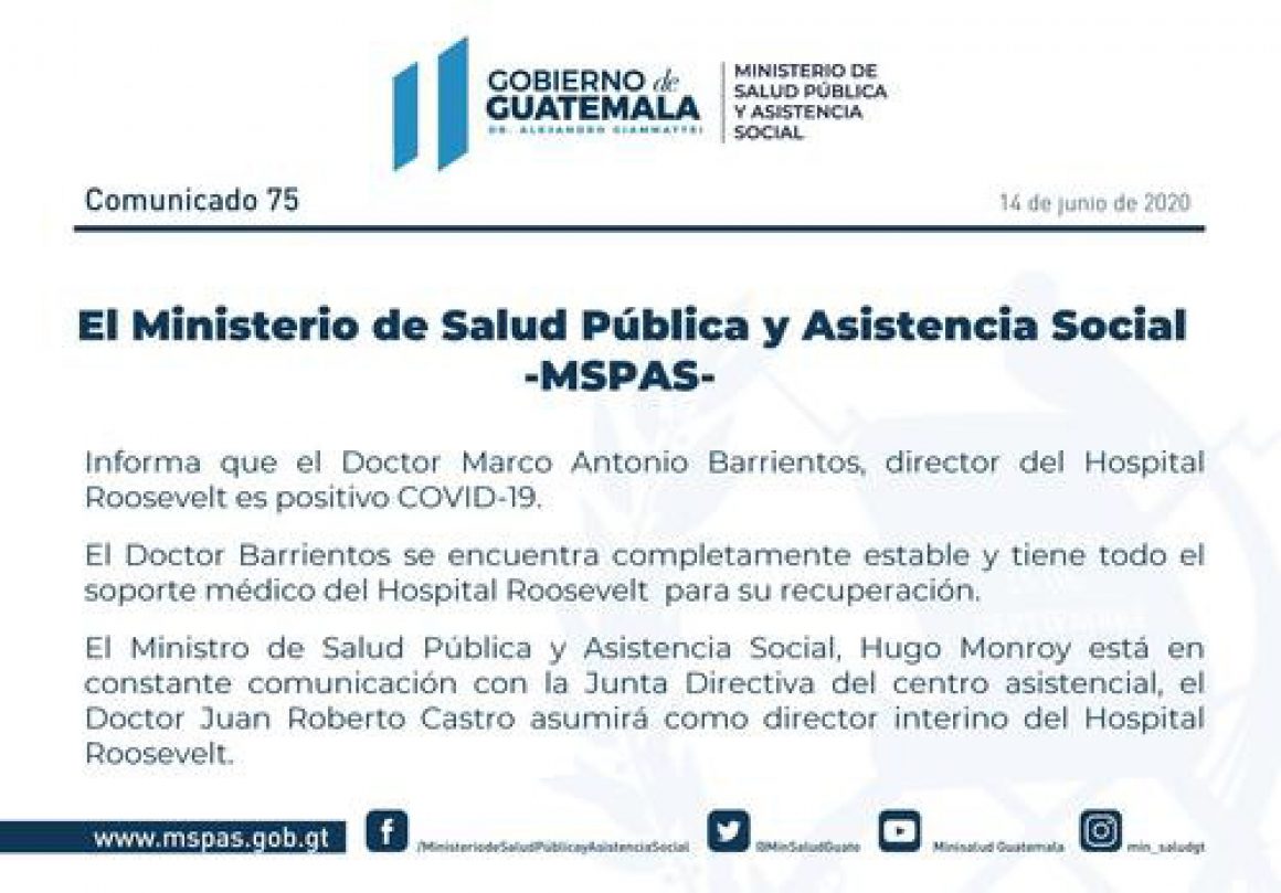 Un comunicado del Ministerio de Salud Pública y Asistencia Social (MSPAS), confirmó que el doctor Marco Antonio Barrientos dio positivo a la prueba de COVID-19 y anunció que el doctor Juan Roberto Castro asume como director interino.