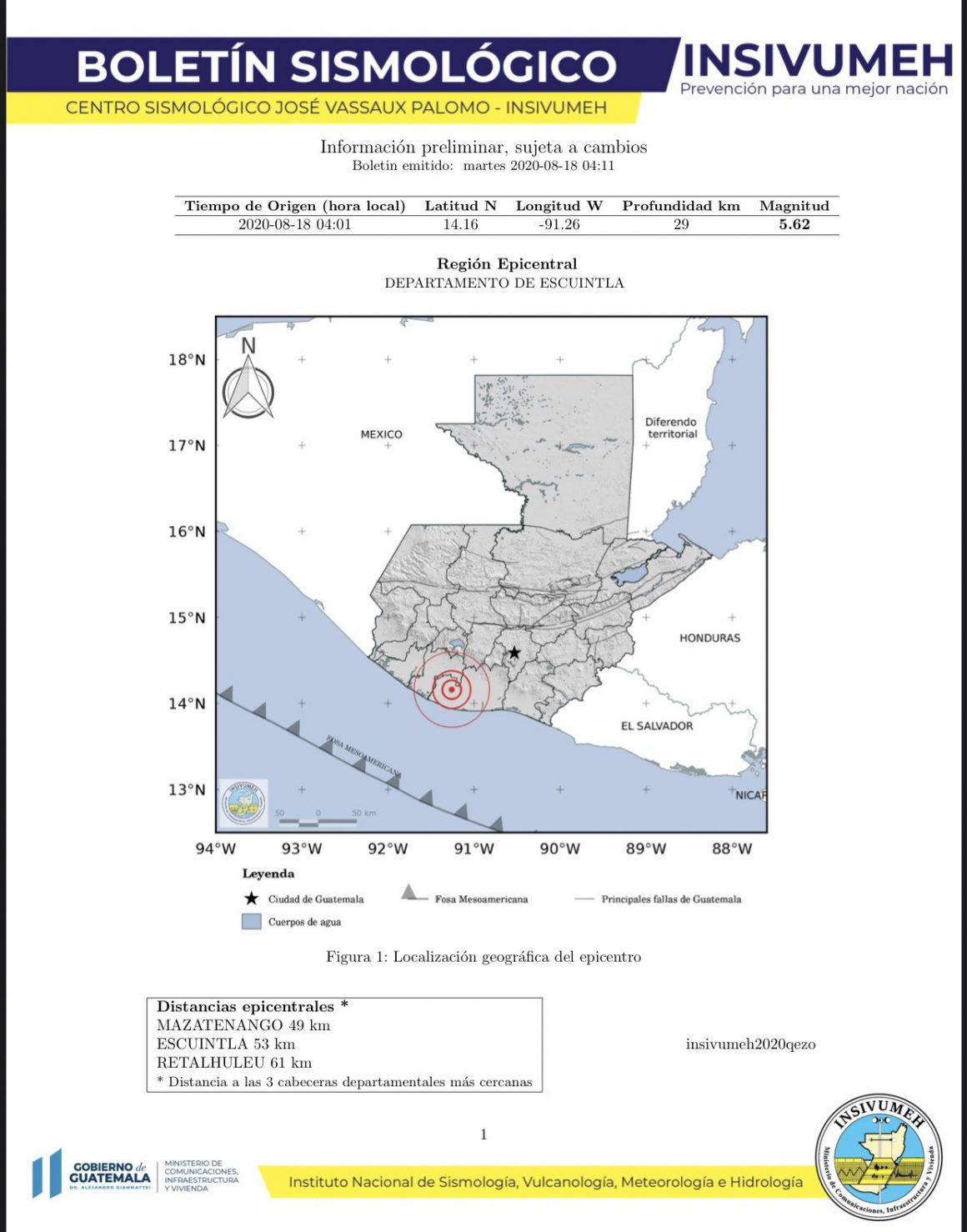 Según el boletín sismológico del INSIVUMEH, la profundidad del sismo fue de 29 kilómetros, la distancia epicentral de los principales departamentos cercanos es de: 53 kilómetros de la cabecera departamental Escuintla, 49 kilómetros de Mazatenango y a 61 kilómetros de Retalhuleu.