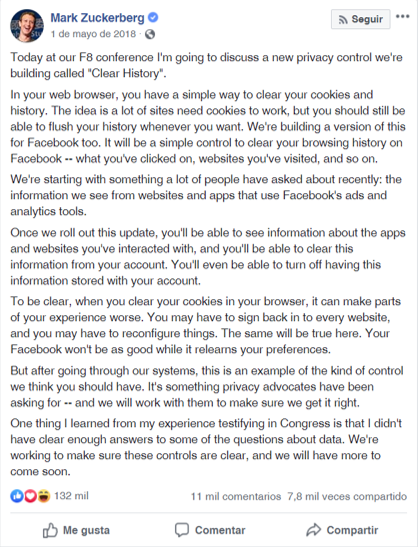 La característica aparecerá este año luego de haber sido anunciada en mayo del 2018 en medio del escándalo de Cambridge Analytica por el uso indebido de datos de miles de personas. Mark Zuckerbeg realizó un post explicando en que consistiría:
