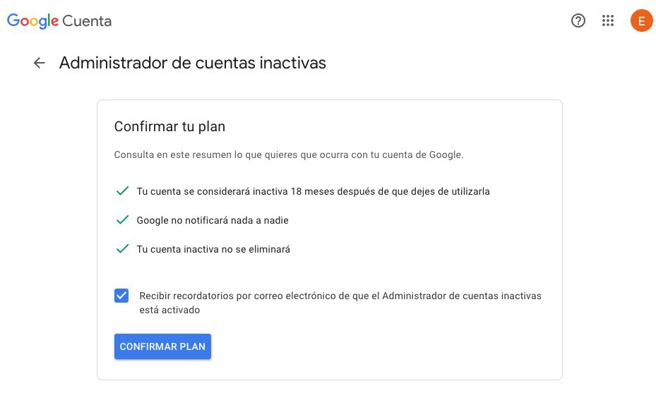 Recuerda confirmar el plan y verificar que la opción de recibir recordatorios esté activada por defecto. De esta manera, estarás asegurándote de que tu legado digital se gestione según tus preferencias.